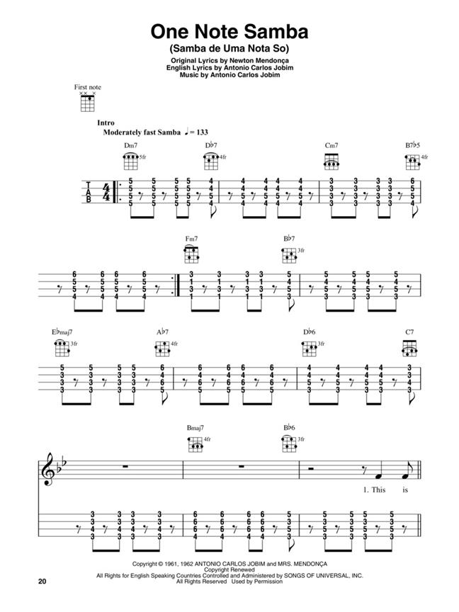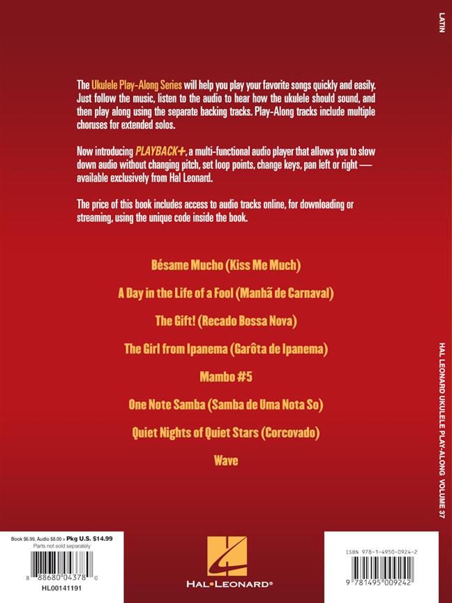 The Ukulele Play-Along series will help you play your favorite songs quickly and easily, with incredible backing tracks to help you sound like a bona fide pro! Just follow the written music, stream or download the online audio to hear how the ukulele should sound, and then play along with the separate backing tracks. The melody and lyrics are included in the book in case you want to sing, or to simply help you follow along. The audio is enhanced so Mac and PC users can adjust the recording to any tempo without changing the pitch! This volume includes 8 of your favorite contemporary songs: Besame Mucho (Kiss Me Much) - A Day in the Life of a Fool (Manha De Carnaval) - The Gift! (Recado Bossa Nova) - The Girl from Ipanema (Garota De Ipanema) - Mambo #5 - One Note Samba (Samba De Uma Nota So) - Quiet Nights of Quiet Stars (Corcovado) - Wave.