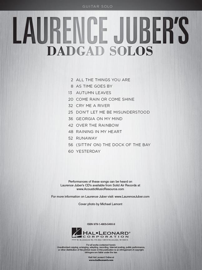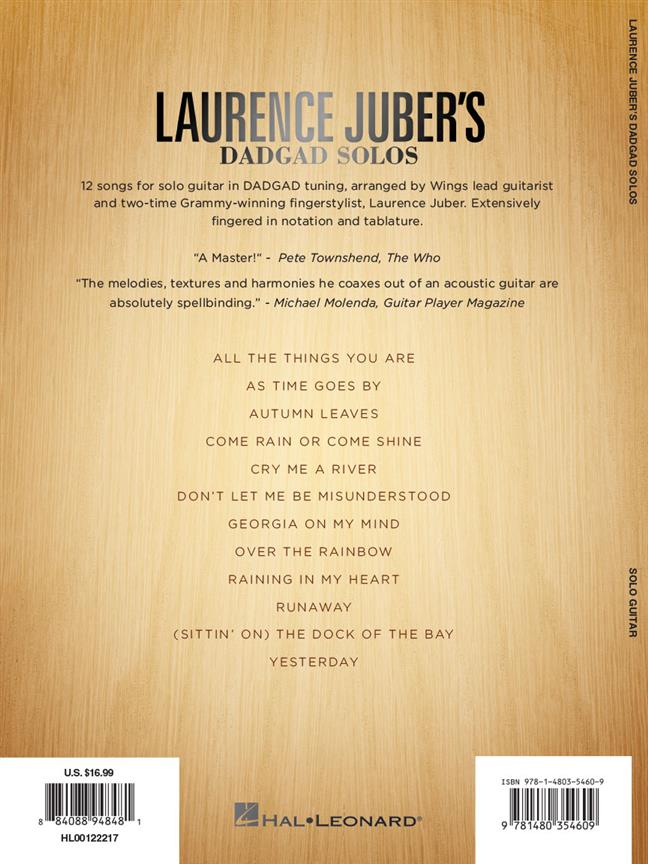 12 songs for solo guitar in DADGAD tuning, arranged by Wings lead guitarist and two-time Grammy-winning fingerstylist, Laurence Juber. Extensively fingered in notation and tablature, the songs include: As Time Goes By - Come Rain or Come Shine - Don't Let Me Be Misunderstood - Over the Rainbow - Runaway - (Sittin' On) The Dock of the Bay - Yesterday - and more. "The melodies, textures and harmonies he coaxes out of an acoustic guitar are absolutely spellbinding.” - Michael Molenda, Guitar Player magazine