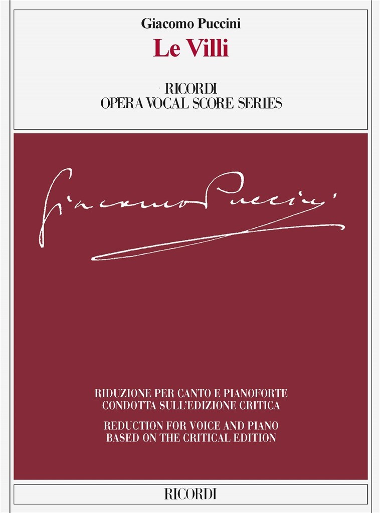 What is being presented here is the piano vocal score of Le Villi, Giacomo Puccini’s first stage work, the full score of which was published by Casa Ricordi (NR 141755) in 2020.The premiere of Le Villi took place at the Teatro Regio in Turin on 27 December 1884, and was followed by a Milanese performance at Teatro alla Scala on 24 January 1885: both productions were quite well received by critics and public alike.The critical edition by Martin Deasy is based on the autograph score that Puccini initially prepared for the one-act version (Willis), and later modified for the two-act, revised version (Villi). Pursuing a groundbreaking philological approach, the editor has, furthermore, taken into proper consideration the contemporaneous printed editions of the piano vocal score, which constitute, in his view, the principal collateral sources, if one is to consider the particular genesis of this work. For it is certain that Puccini, upon entering the Sonzogno competition, submitted a score of Willis that lacked proper orchestration in a few pages and displayed, above all, incomplete vocal lines. However, he also provided a manuscript reduction for piano and vocal score (now lost, except for the final Number of Willis) that was undoubtedly more detailed, as far as the vocal lines were concerned. The editor demonstrates that the vocal material realized for the first performance of Willis was not derived from the autograph score, but from the lost score reduction. The latter also served as the basis for the preparation of Ricordi’s printed edition of the piano vocal score.