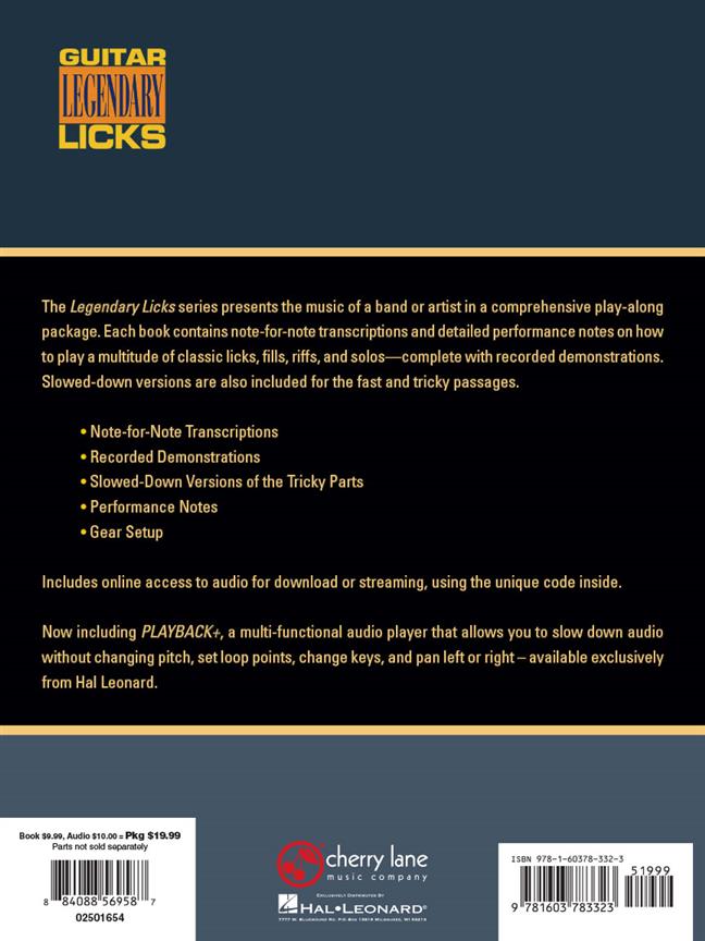La série légendaire Licks présente la musique d'un groupe ou d'un artiste d'une manière globale play-along package. Chaque livre contient la note-à-note transcriptions et les notes de performance détaillées sur la façon de jouer une multitude de licks classiques, remplit, riffs et solos complets - avec des démonstrations enregistrées. Le CD comporte également ralenti versions pour les passages rapides et délicate.