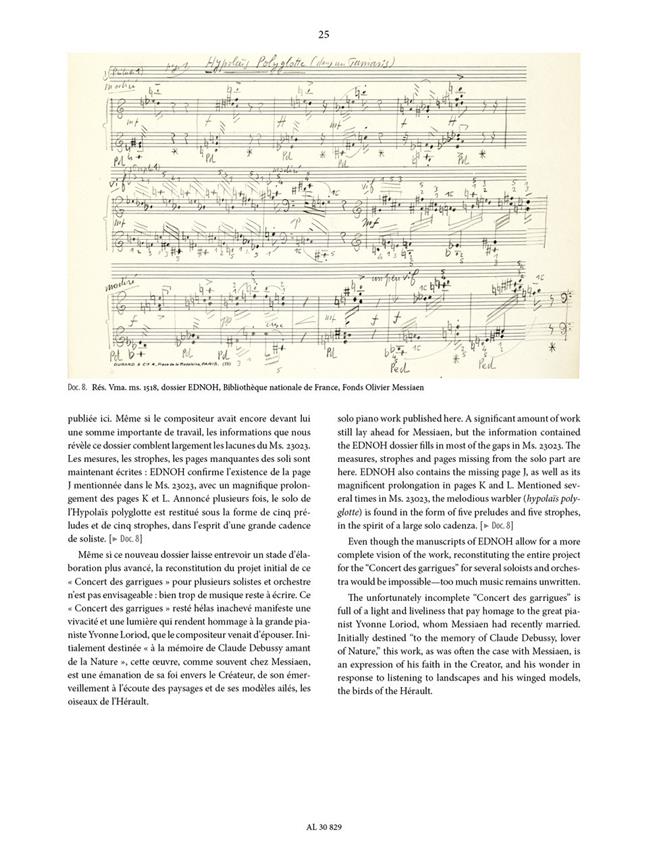 Olivier Messiaen avait imaginé autour de 1960 un grand concerto pour piano, différents solistes et orchestre sur les " Oiseaux de l'Hérault " qui est resté inachevé, mais la partie du piano soliste était déjà largement élaborée. La Fondation Olivier Messiaen a confié au pianiste Roger Muraro, interprète reconnu de l'oeuvre de Messiaen, le soin d'organiser les esquisses et les manuscrits retrouvés dans les archives du compositeur. Cette nouvelle parution est née du travail de recherche entrepris par Roger Muraro, dont il détaille la méthode dans l'importante étude qui ouvre le volume. Celle-ci révèle entre autres la proximité musicale de l'oeuvre avec Sept Haïkaï. Enrichie de nombreux fac-similés, d'exemples et de photographies, cette introduction retrace la genèse et le contexte historique, invite à pénétrer dans l'atelier du compositeur et propose des conseils d'interprétation. Fauvettes de l'Hérault - Concert des garrigues pour piano seul est un " concert sans orchestre " où se mêlent un hommage à Claude Debussy, une dédicace à peine voilée à la pianiste Yvonne Loriod, de nouveaux chants d'oiseaux de l'Hérault, et l'immense palette de rythmes, de timbres et de couleurs si caractéristique de l'univers sonore d'Olivier Messiaen. Olivier Messiaen avait imaginé autour de 1960 un grand concerto pour piano, différents solistes et orchestre sur les " Oiseaux de l'Hérault " qui est resté inachevé, mais la partie du piano soliste était déjà largement élaborée. La Fondation Olivier Messiaen a confié au pianiste Roger Muraro, interprète reconnu de l'oeuvre de Messiaen, le soin d'organiser les esquisses et les manuscrits retrouvés dans les archives du compositeur. Cette nouvelle parution est née du travail de recherche entrepris par Roger Muraro, dont il détaille la méthode dans l'importante étude qui ouvre le volume. Celle-ci révèle entre autres la proximité musicale de l'oeuvre avec Sept Haïkaï. Enrichie de nombreux fac-similés, d'exemples et de photographies, cette introduction retrace la genèse et le contexte historique, invite à pénétrer dans l'atelier du compositeur et propose des conseils d'interprétation. Fauvettes de l'Hérault - Concert des garrigues pour piano seul est un " concert sans orchestre " où se mêlent un hommage à Claude Debussy, une dédicace à peine voilée à la pianiste Yvonne Loriod, de nouveaux chants d'oiseaux de l'Hérault, et l'immense palette de rythmes, de timbres et de couleurs si caractéristique de l'univers sonore d'Olivier Messiaen.