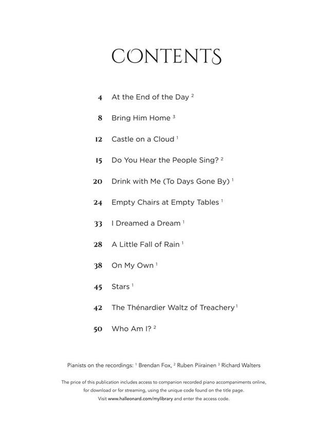 Retrouvez 12 chansons extraites de la fameuse comédie musicale, arrangées pour instrumentistes solistes avec les accompagnements de piano enregistrés par des professionnels, et disponibles en téléchargement ou streaming. Parmi la sélection : At the End of the Day · Bring Him Home · Castle on a Cloud · Do You Hear the People Sing? · Drink With Me (To Days Gone By) · Empty Chairs at Empty Tables · I Dreamed a Dream · A Little Fall of Rain · On My Own · Stars · The Thénardier Waltz of Treachery · Who Am I?