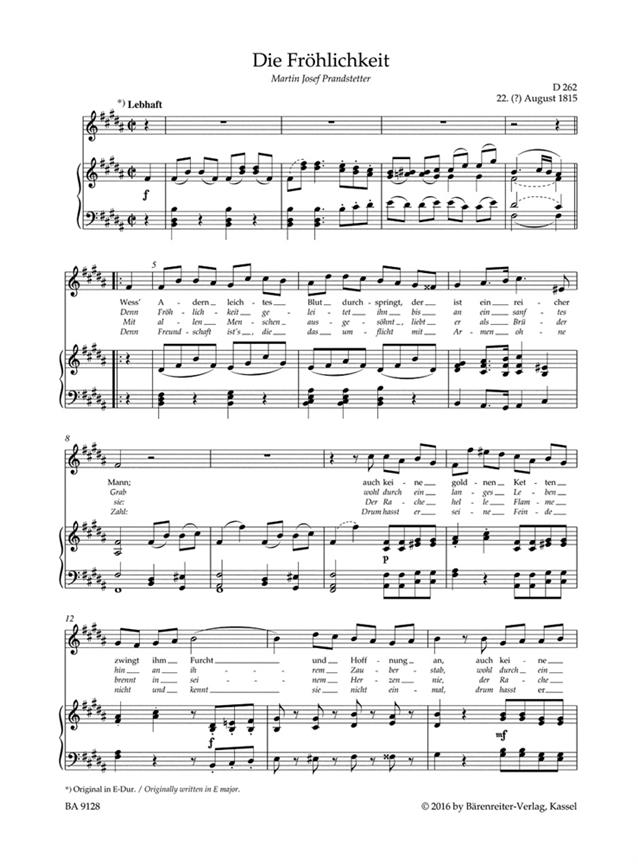 Walther Dürr presents Volume 8 of the new Urtext edition of Schubert's lieder in separate editions for high, medium and low voice. This volume contains lieder originating during the latter half of 1815, between August and November. Three series of lieder, each based on a particular poet, immediately catch the eye: a number of Ossian settings, a group of Klopstock lieder and finally another set on texts that Schubert found in a Viennese almanac (Selam). Furthermore, the series of Schubert lieder on texts by the North German poet Ludwig Theobul Kosegarten which starts in Volume 7, is concluded in this volume.