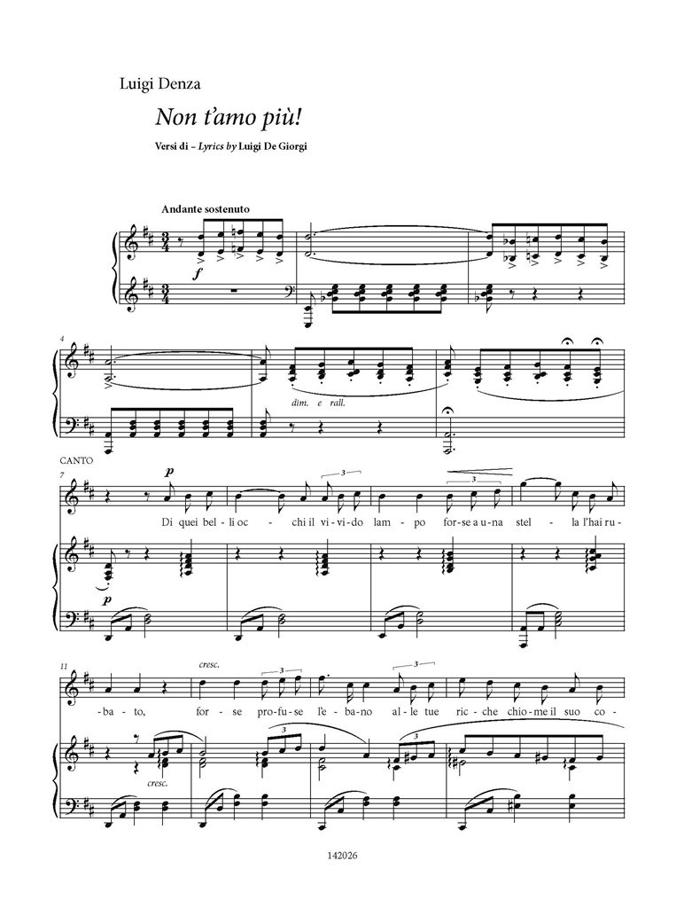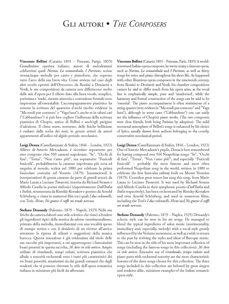 Sommaire : Vincenzo Bellini: Ma rendi pur contento - Vaga luna, che inargenti • Luigi Denza: Non t’amo più! • Stefano Donaudy: O del mio amato ben - Vaghissima sembianza • Gaetano Donizetti: Amore e morte • Stanislao Gastaldon: Musica proibita • Ruggero Leoncavallo: Mattinata • Pietro Mascagni: Serenata • Gioachino Rossini: La danza - La promessa • Francesco Paolo Tosti: Aprile - Ideale - L’ultima canzone • Giuseppe Verdi: Ad una stella