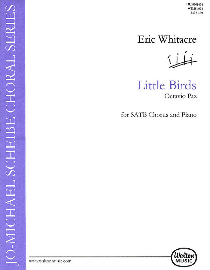 5 ex. minimum. This is the third setting of words by Octavio Paz (Water Night; Cloudburst) from this successful young California composer. Little Birds pays homage to Gabriel Fauré with its running piano part and fluid sensualmelodies. According to the composer “it holds mysterious and magical effects”, imitating delicate birds. Suitable for festival or competition use. The piano part is available separately as well as in the vocal score.Moderately difficult.