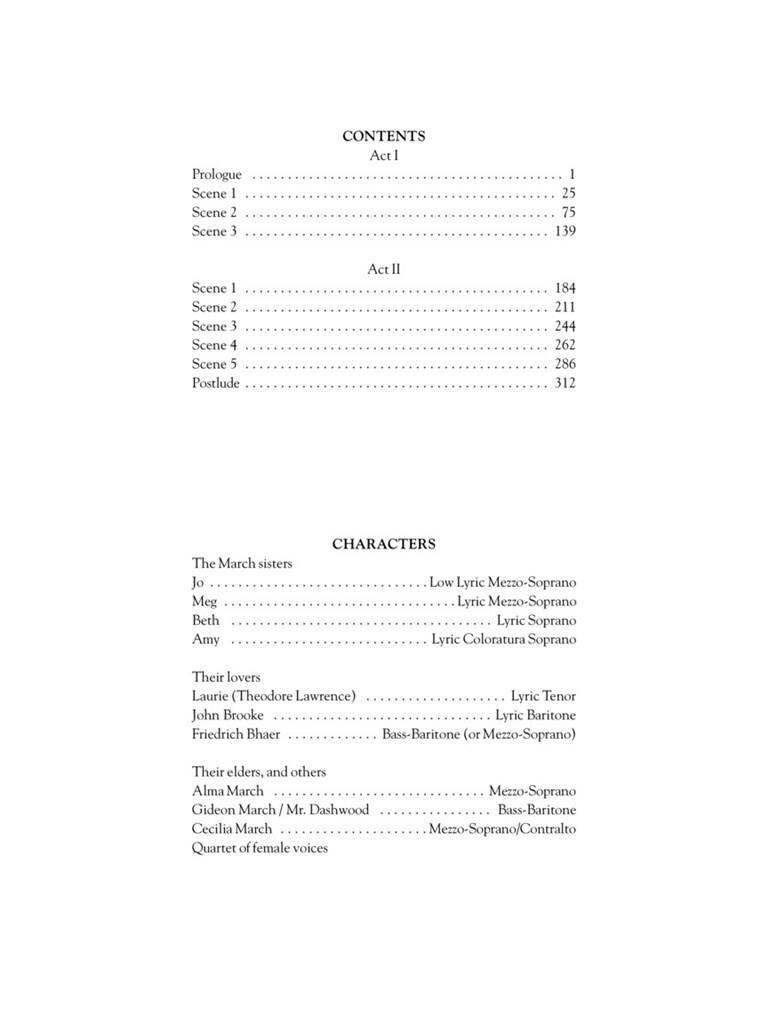 Commandé par le Houston Grand Opera pour son Opera Studio, Les Quatre Filles du docteur March de Mark Adamo a été créé le 13 mars 1998. Le livret de l’opéra (également écrit par Adamo et disponible à la vente, HL50484155) adapte le roman classique de Louisa May Alcott sur quatre sœurs qui atteignent leur majorité juste après la guerre de Sécession. Explorant trois thèmes centraux du livre, l’opéra d’Adamo se concentre sur la résistance de Jo March au passage du temps. Puissamment théâtrale et musicalement sophistiqué, Les Quatre Filles du docteur docteur contient notamment une richesse de mélodies mémorables et d’airs mélodieux. Un enregistrement en CD de la production du Houston Grand Opera est également disponible sur Ondine ODE 988-2D ; la production a récemment été diffusée à l’échelle nationale dans une émission télévisée haute définition produite par PBS.