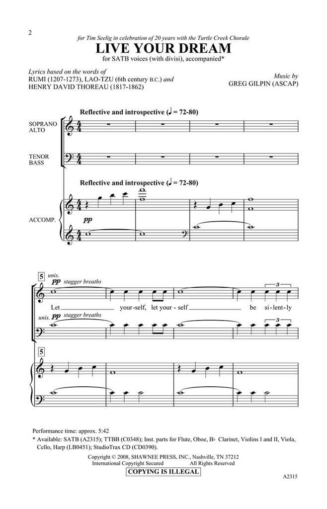 Cette œuvre chorale majeure de Greg Gilpin est un hommage émouvant à nos rêves et nos quêtes. Avec des paroles basées sur les paroles de « Rumi », « Lao-Tzu » et « Thoreau », la musique originale et l’arrangement choral de Greg sont pleins d’une force émotionnelle qui donne au texte une signification musicale. Une sélection parfaite pour la remise des diplômes ou la fin de l’année ! « Live Your Dream » a été magnifiquement orchestré par Steven Couch. Disponible séparément : SATB, TTBB, CD StudioTrax, Orchestration.