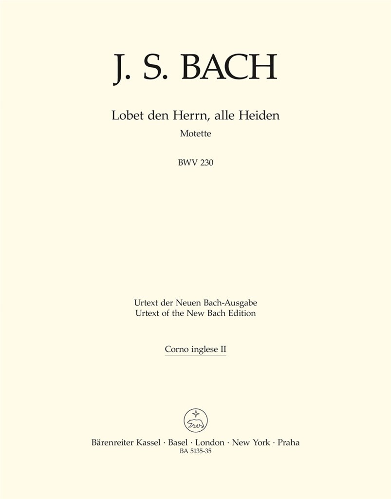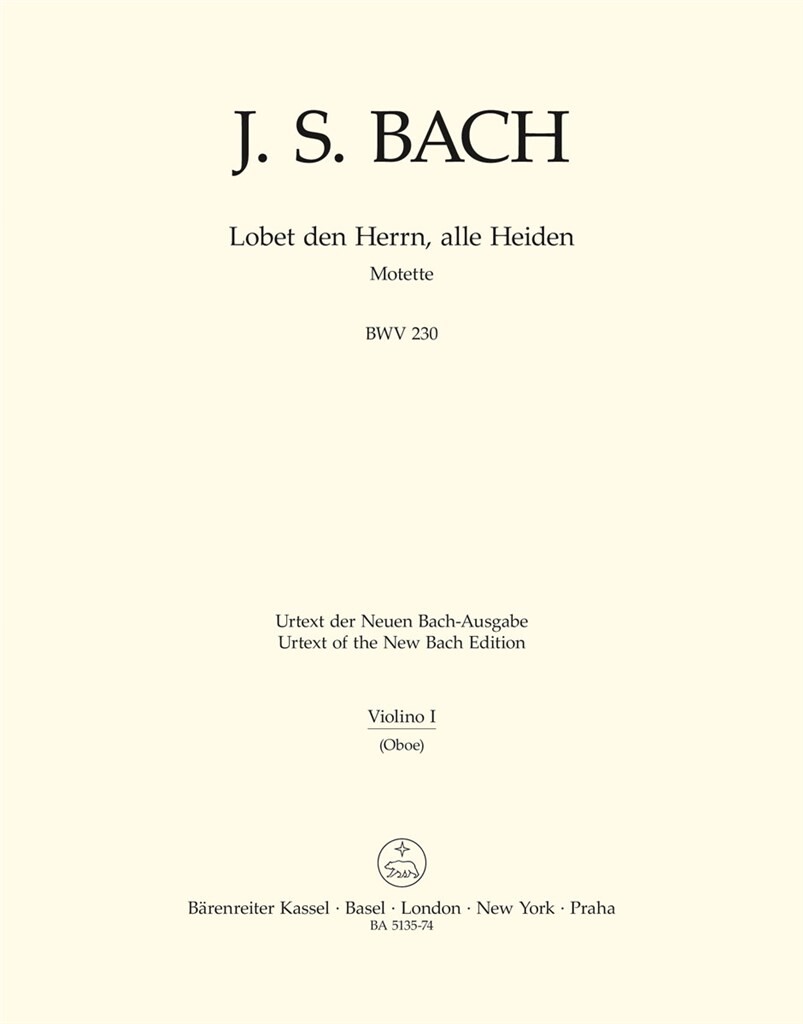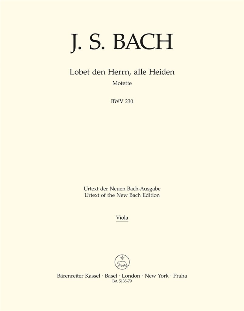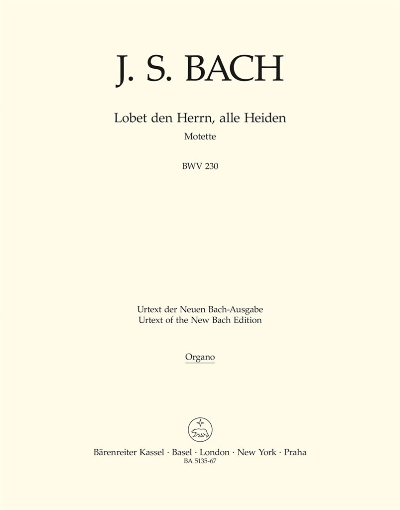Lobet den Herrn, alle Heiden BWV 230 - Motet for four-part mixed choir. In Bach’s voluminous output of music the motets form a small group of modest proportions, particularly as compared to the 200 or so surviving cantatas. In historical perspective, however, the corpus of motets is especially distinguished, being the only part of Bach’s vocal oeuvre whose post-1750 tradition has remained unbroken to the present day. - Urtext of the New Bach Edition