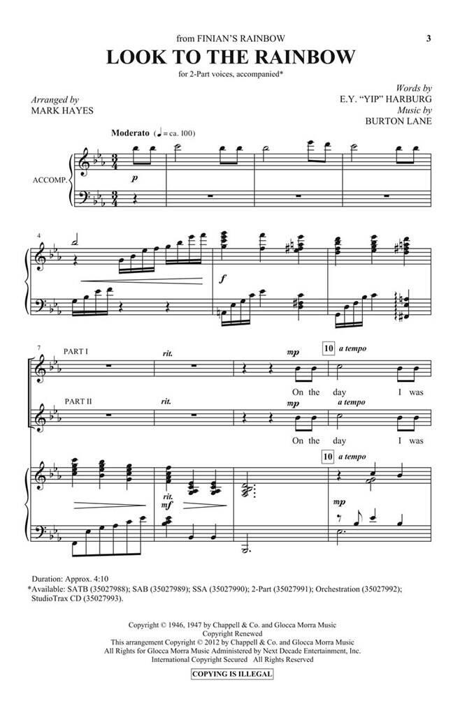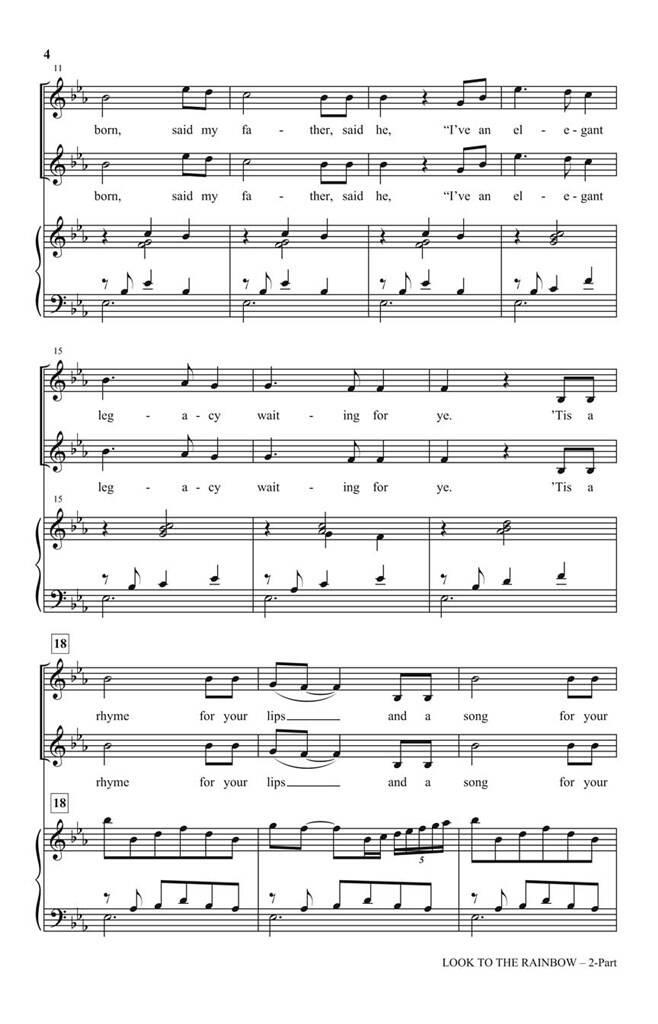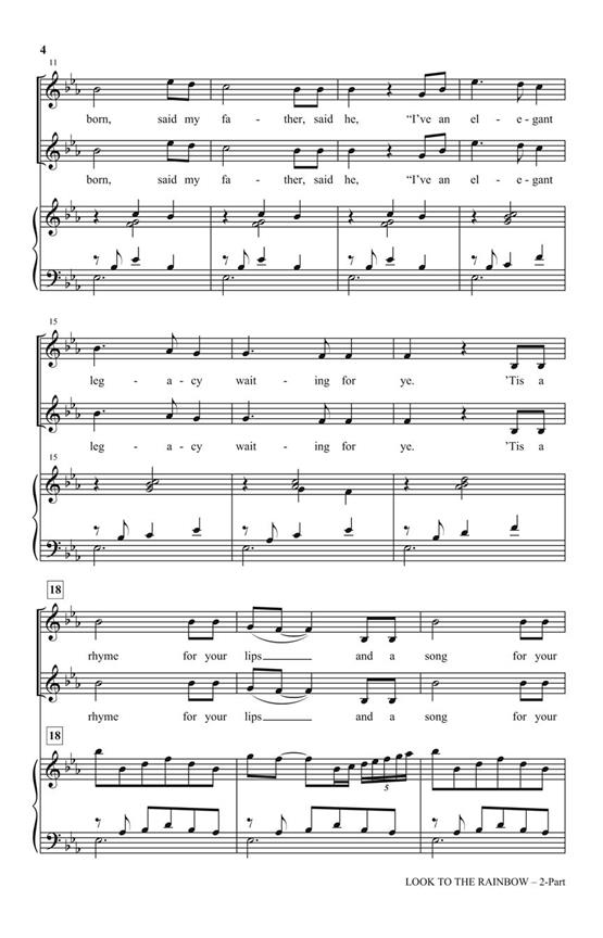 Tiré de Finian’s Rainbow, cet arrangement entièrement orchestré est délicieusement riche en harmonies vocales. Disponible en voicings pour tous les niveaux, la parole inspirante de « suivez votre rêve » n’est jamais plus douce que dans ce chœur. Disponible : SATB : SAB : SSA : 2 parties : Orchestration (Imprimé & Numérique) : CD StudioTrax.