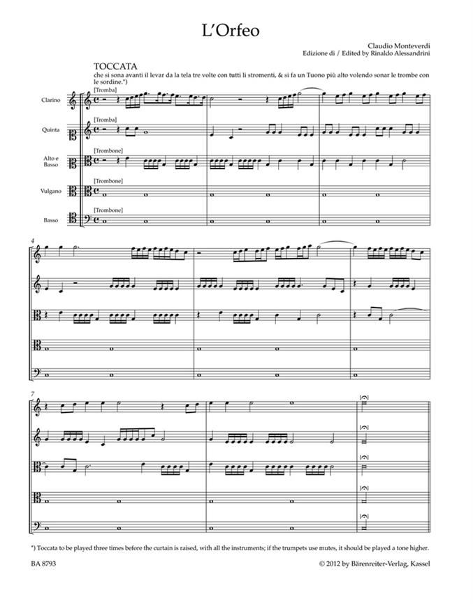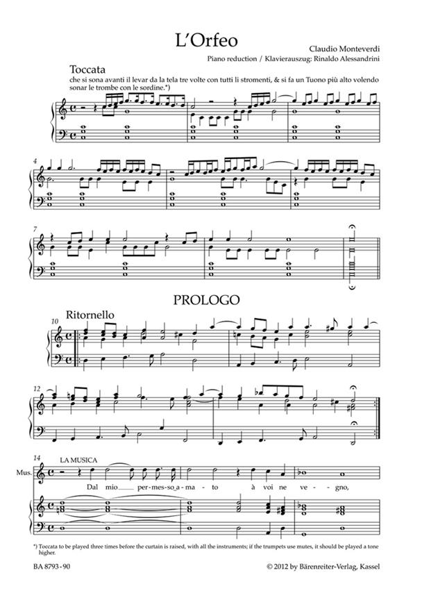 Monteverdi's opera ; L'Orfeo, based on the legend of Thracian singer Orpheus and his love of Eurydice, is a masterpiece of musical declamation and ornamentation. It was first performed during the 1607 carnevale in the ; Palazzo Ducale in Mantua. When an edition remains true to its sources, this certainly does not mean that it is not also practical to use, as is demonstrated in this Bärenreiter edition of Monteverdi's ; L'Orfeo. Edited by Rinaldo Alessandrini, the new publication follows the Bärenreiter edition of Monteverdi's ; Il ritorno d'Ulisse in patria. Two contemporary prints of ; L'Orfeo from the years 1609 and 1615 have been passed down to us. Four copies of each of these prints still survive today in public libraries. The later print includes many corrections to the earlier edition and was accordingly used as the primary source for this Bärenreiter edition. However, when solving musical problems the editor frequently follows the more coherent style of the earlier print. The numerous interesting variants, not only between the two editions but also amongst the eight surviving copies, are listed in the critical commentary. This edition of ; L'Orfeo offers in addition to Monteverdi's somewhat sparse original figures also figures added to the bass line by the editor. The continuo player should, however, feel free to follow his own judgment. The notation has been, when necessary, adapted to suit modern practice, for example with regard to the clefs. The sections that were originally written in ; chiavetta have been transposed a fifth lower. In the appendix these sections also appear in their original notation in facsimile as well as transposed a fourth lower. Detailed introduction by the editor (Ital/Eng/Ger) on the work's genesis and performance practice Comprehensive critical commentary (Eng) in the score Idiomatic piano reduction