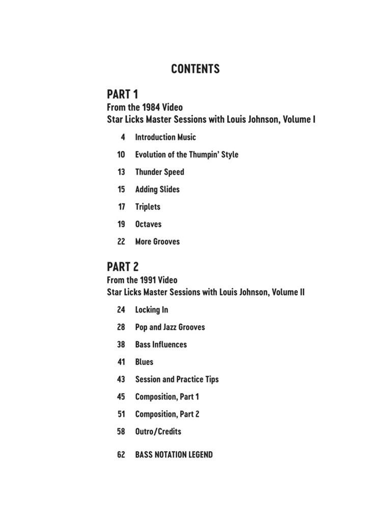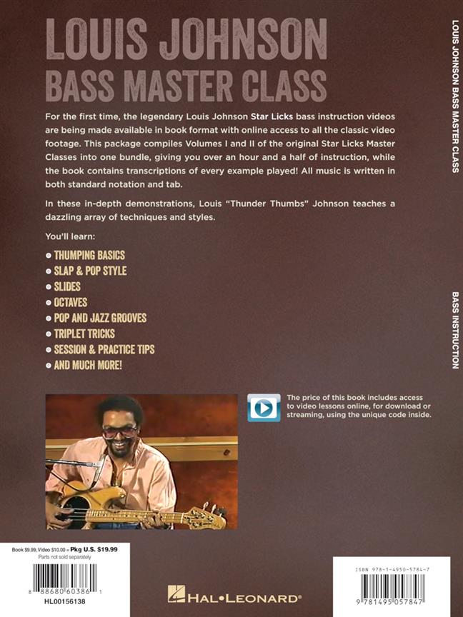 For the first time, the legendary Louis Johnson Star Licks bass instruction videos are being made available in book format with online access to all the classic video footage. This package compiles Volumes I and II of the original Star Licks Master Classes into one bundle, giving you over an hour and a half of instruction, while the book contains transcriptions of every example played! All music is written in both standard notation and tab. In these in-depth demonstrations, Louis Thunder Thumbs Johnson teaches a dazzling array of techniques and styles. You'll learn: thumping basics - slap and pop style - slides - octaves - pop and jazz grooves - triplet tricks - session and practice tips - and much more.