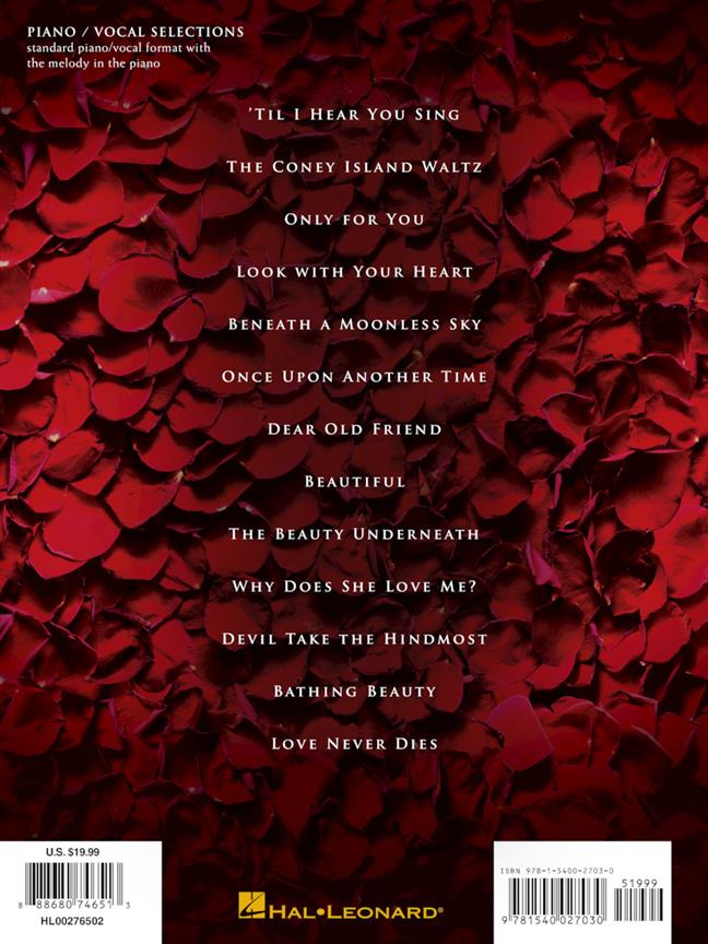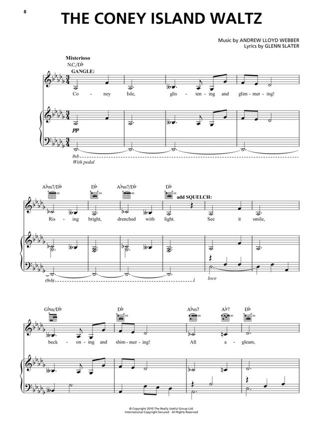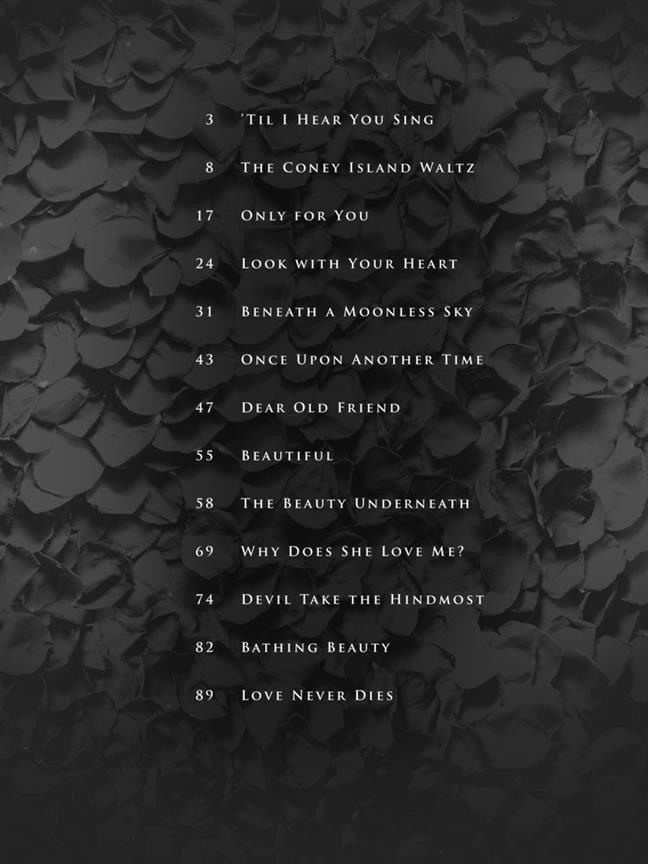Ces 13 chansons de la comédie musicale de Broadway, qui ont aussi servi au fameux Fantôme de l'Opéra, sont arrangées ici pour la formation piano / chant standard, avec la mélodie incluse dans la partie de piano. Cette sélection inclut les titres suivants : Bathing Beauty - Once upon Another Time - Beautiful - The Beauty Underneath - Beneath a Moonless Sky - The Coney Island Waltz - Dear Old Friend - Devil Take the Hindmost - Look with Your Heart - Love Never Dies - Only for Him/Only for You - 'Til I Hear You Sing - Why Does She Love Me?