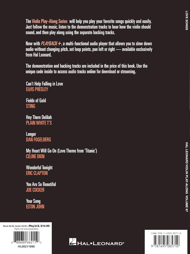 The Violin Play-Along series will help you play your favorite songs quickly and easily. Just follow the music, listen to the online audio to hear how the violin should sound, and then play along using the separate backing tracks. With the melody and lyrics included in the book, you may also choose to sing along. Chord symbols are provided should you wish to elaborate on the melody. The audio includes PLAYBACK+ features that allow you to loop passages, change the tempo, and more. This volume includes: Can't Help Falling in Love - Fields of Gold - Hey There Delilah - Longer - My Heart Will Go On (Love Theme from 'Titanic') - Wonderful Tonight - You Are So Beautiful - Your Song.