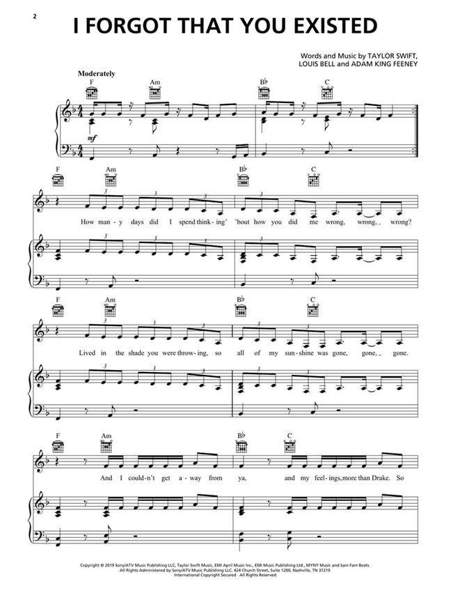 Matching folio to Taylor's latest blockbuster, record-breaking, chart-topping album featuring 18 songs including: The Archer - Cruel Summer - I Think He Knows - London Boy - Lover - The Man - Me! - Paper Rings - You Need to Calm Down - and many more! Songs are arranged for piano and voice with guitar chord frames.