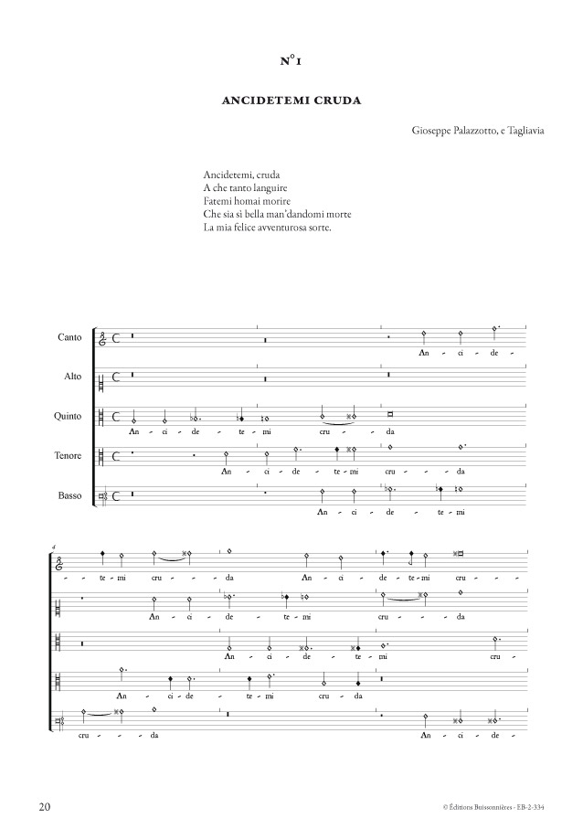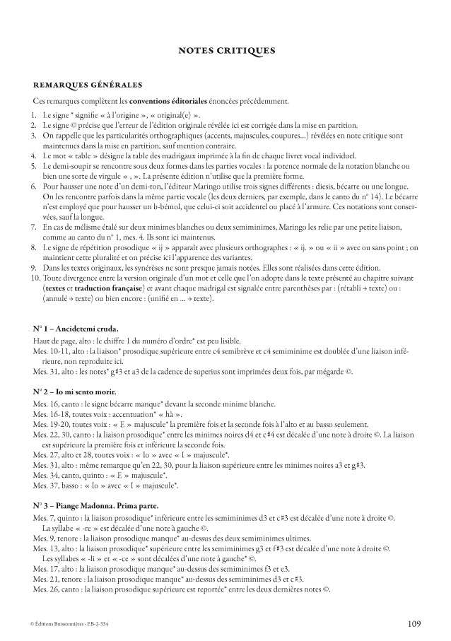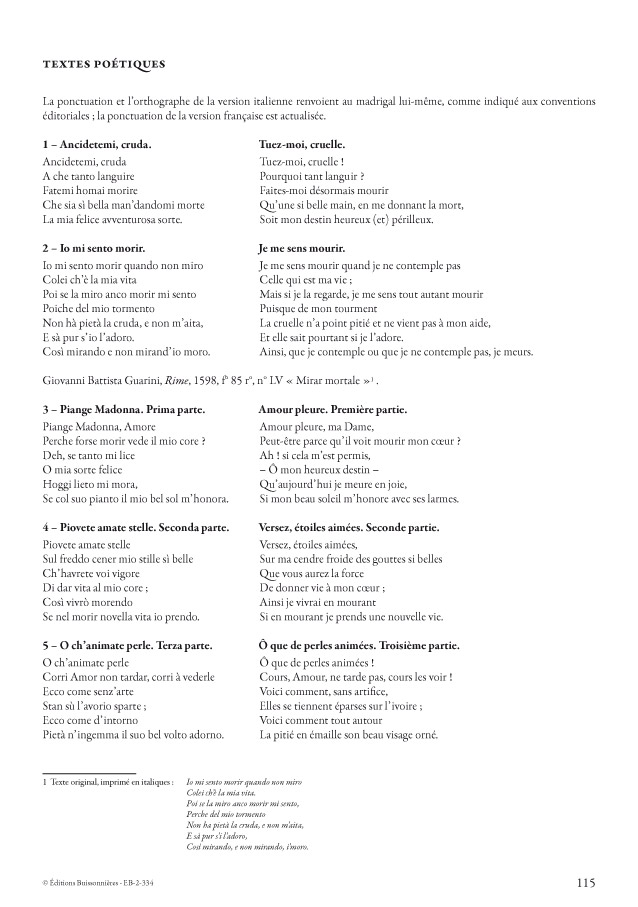 La collection Madrigali propose un choix de livres de madrigaux des xvie et xviie siècles n’ayant fait l’objet ni d’une édition récente ni d’une mise en partition, pour la plupart d’entre eux. Outre cet intérêt historique, la collection a l’avantage de réunir les différentes voix de la polyphonie sous l’extension du logiciel Finale* réalisée par Boris Freulon, intitulée Notation xvie. Remarquable sur le plan esthétique, cet outil informatique reproduit très fidèlement une graphie musicale de la Renaissance et permet de révéler les œuvres de l’époque sous leur format d’origine. Un tel attachement à l’imprimerie renaissante entre dans le cadre d’une relation inaliénable entre le signe musical et la pensée qui l’engendre. Quelques pièces annexes entourent la partie musicale, sans alourdir le fascicule ; ainsi, les éléments biographiques, analytiques ou critiques sont limités à quelques pages et renvoient à différentes publications musicologiques correspondantes. Ce type de restitution constitue un outil précieux pour tout musicien soucieux de découvrir les œuvres dans leur ensemble et sans déformation ; qu’ils soient musicologues, chanteurs ou simplement attirés par le répertoire madrigalesque, ils trouvent ici un matériel de base sur lequel appuyer leur étude.