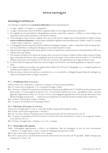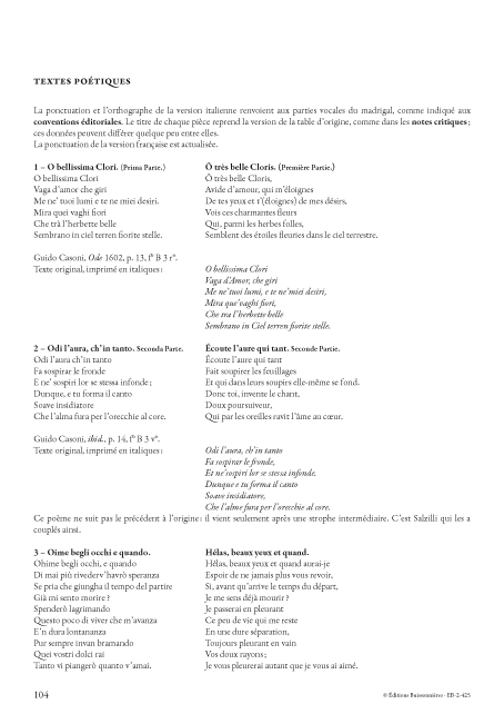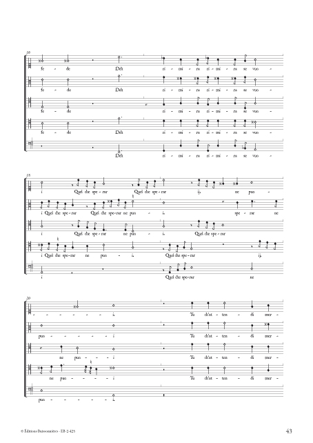 La collection Madrigali propose un choix de livres de madrigaux des xvie et xviie siècles n’ayant fait l’objet ni d’une édition récente ni d’une mise en partition, pour la plupart d’entre eux. Outre cet intérêt historique, la collection a l’avantage de réunir les différentes voix de la polyphonie sous l’extension du logiciel Finale* réalisée par Boris Freulon, intitulée Notation xvie. Remarquable sur le plan esthétique, cet outil informatique reproduit très fidèlement une graphie musicale de la Renaissance et permet de révéler les œuvres de l’époque sous leur format d’origine. Un tel attachement à l’imprimerie renaissante entre dans le cadre d’une relation inaliénable entre le signe musical et la pensée qui l’engendre. Quelques pièces annexes entourent la partie musicale, sans alourdir le fascicule ; ainsi, les éléments biographiques, analytiques ou critiques sont limités à quelques pages et renvoient à différentes publications musicologiques correspondantes. Ce type de restitution constitue un outil précieux pour tout musicien soucieux de découvrir les œuvres dans leur ensemble et sans déformation ; qu’ils soient musicologues, chanteurs ou simplement attirés par le répertoire madrigalesque, ils trouvent ici un matériel de base sur lequel appuyer leur étude.