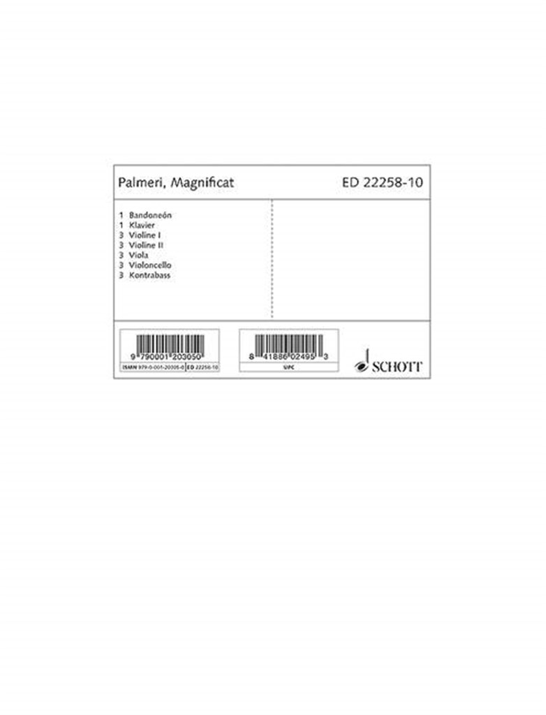 Der argentinische Komponist Martín Palmeri legte mit diesem Werk eine ausführliche Magnificat-Vertonung der besonderen Art vor: Mit Bandoneón und Klavier, dazu ein Streichorchester zum gemischten Chor beeindruckt es durch südamerikanischen Sound neben klassischen und traditionellen Elementen.