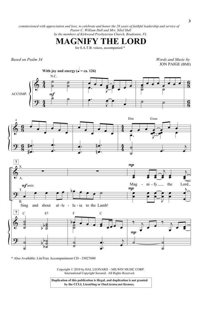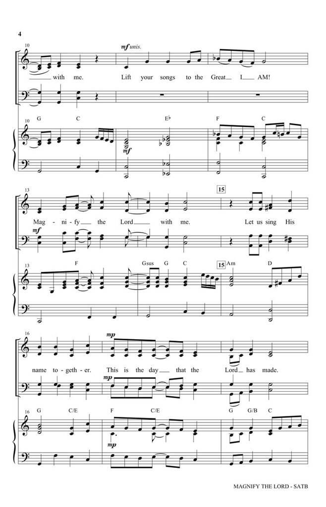 Utilisations : Général, Appel au culte, Jeunesse Écriture : Psaume 34:3 ; Psaume 18:46 Cet hymne mêle traditionnel et contemporain dans la même chanson avec un langage musical joyeux qui danse entre les deux styles. Transmettant un message tiré des Psaumes, l’œuvre comble le fossé pour les églises offrant des offices traditionnels/mixtes. Les jeunes et les adultes se connecteront à son message jubilatoire et louable.