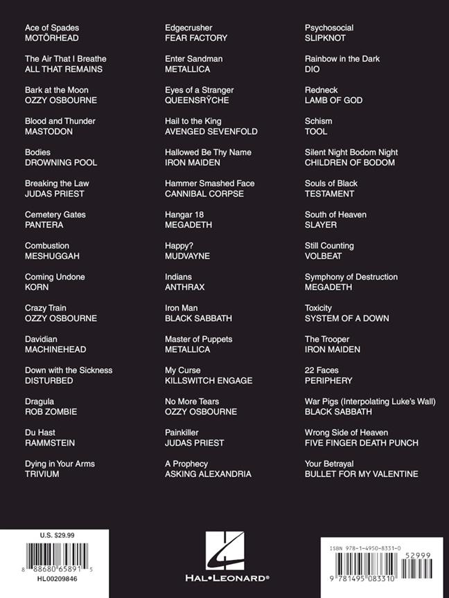 Shred your axe and thrash your big hair through the air with this jam-packed collection of 45 metal faves in note-for-note guitar trancriptions with tab. Songs include: Ace of Spades - Bark at the Moon - Breaking the Law - Crazy Train - Dying in Your Arms - Enter Sandman - Hail to the King - Iron Man - Master of Puppets - No More Tears - Painkiller - Redneck - Symphony of Destruction - Toxicity - War Pigs (Interpolating Luke's Wall) - Your Betrayal - and more. 430 pages of awesomeness!