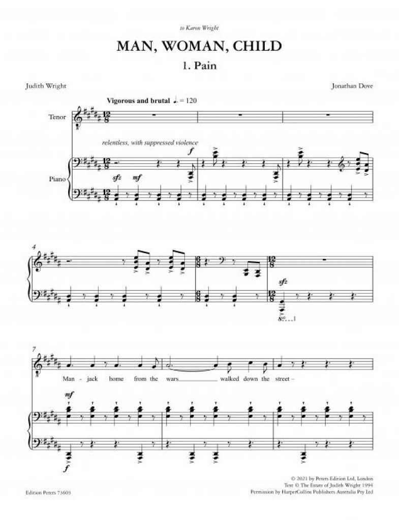Man, Woman, Child by Jonathan Dove is an 18-minute song cycle with texts by Australian poet Judith Wright comprising of six songs for Soprano, Tenor and Piano. They tell the story of a man, coming home from war, who meets a woman in a wine bar: it ends with the voice of the child that emerges from this union. Commissioned to celebrate the 25th Anniversary of Samling Institute for Young Artists and dedicated to all those who have shared with us their love of words and music. It was first performed in November 2021 at Wigmore Hall by Alexandra Lowe, Filipe Manu and James Baillieu.