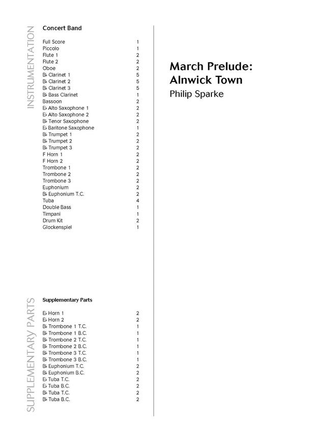 March Prelude: Alnwick Town est une commande de l’Alnwick Playhouse Concert Band (dirigé par Ray Thompson) pour célébrer ses vingt-cinq premières années. La pièce s’oeuvre majestueusement avec des phrases qui se répondent entre les divers pupîtres de l’orchestre, avant l’arrivée d’une section plus rapide en forme de marche le thème principal faisant écho aux rythmes des phrases d’ouverture. Un passage de transition comprenant des fragments pour saxophones et trompettes mène un nouveau thème de nature plus legato qui est répété après chaque changement de tonalité. Le passage de transition revient pour annoncer une réexposition du thème principal, avant la réapparition du matériel du début pour clore la pièce de façon grandiose.
