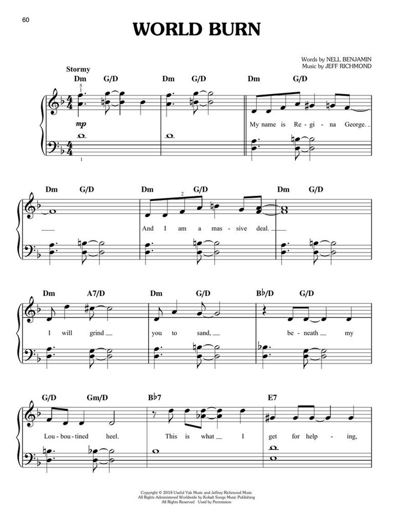 This 2018 Broadway adaptation of the hit 2004 movie about the cut-throat social status of a group of teenage girls features lyrics by Nell Benjamin with music by Jeff Richmond and was nominated for several Tony Awards®. Our folio includes 10 songs in easy piano arrangements: