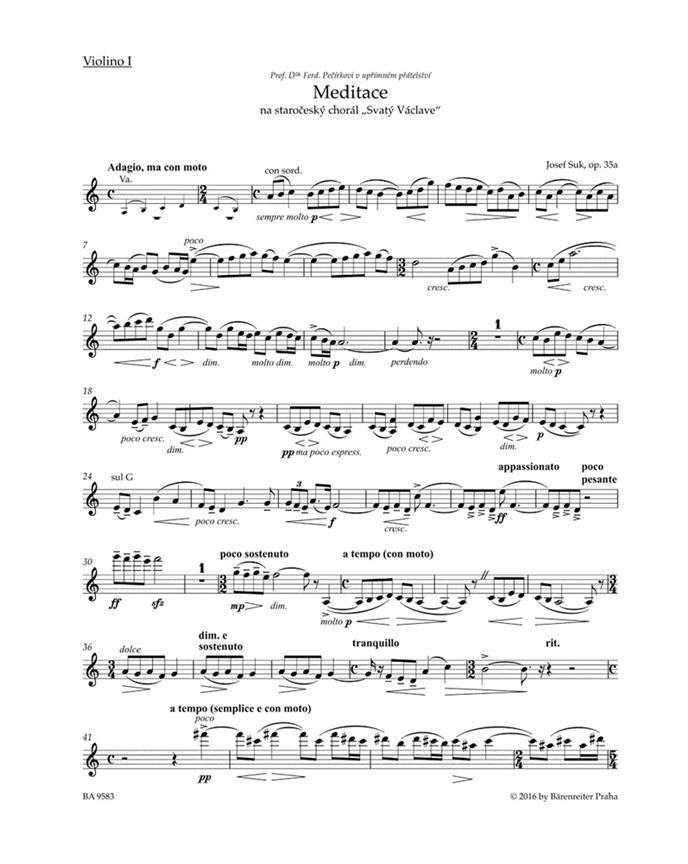 The Bohemian String Quartet performed this single-movement Meditation for the first time on 27 September 1914 - the premiere of the version for string orchestra followed on 22 November 1914, played by the Czech Philharmonic. That same year the piece was published by Fr. A. Urbánek together with arrangements for piano and organ.
