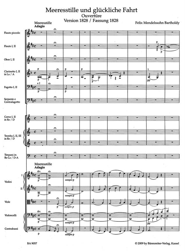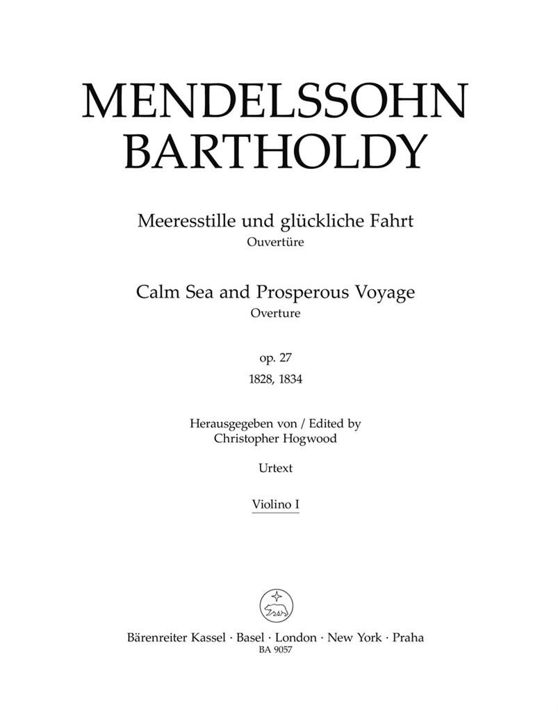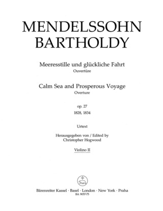 Bärenreiter's critical edition of Felix Mendelssohn Bartholdy's ; symphonic poem overture Calm Sea and Prosperous Voyage edited by Christopher Hogwood, belongs to our series of seven overtures by the 19th century master. Calm Sea and Prosperous Voyage is known today only in the version from 1834 and our new edition offers a critical edition of this version. But unknown to modern ears is an early version with an additional 50 bars of this overture from 1828 which only survives in a manuscript copy from the composer's estate. Bärenreiter offers for the first time the 1828 versionin score and parts followed by the 1834 version in score and parts - A must for every orchestra and library - Includes two versions back to back - Full score & parts (BA9057) available for sale