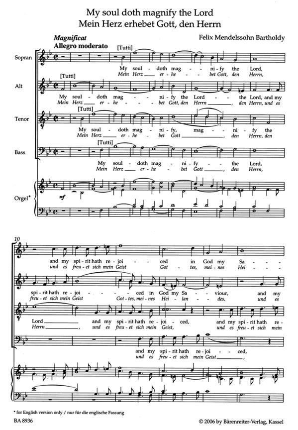 My soul doth magnify the Lord Op. 69 Mendelssohn's Three Motets, Op. 69, and Three Psalm Settings, Op. 78, belong to the standard repertoire of many choruses and vocal ensembles. Our editions, the work of two leading Mendelssohn specialists, Hiromi Hoshino and Michael Cooper, present these pieces in separate volumes reflecting the latest state of scholarly research. We also offer a separate edition of Psalm 91, ; For He shall give His angels charge, in its original setting for eight-part a cappella chorus. (Mendelssohn later incorporated it into ; Elijah with an orchestral accompaniment). Each edition contains the original Germantext and the English translation authorized by the composer himself. A two-stave reduction of the vocal parts has been added as an aid in rehearsal. Complete editions are available with critical reports and introductions in German and English. - Urtext at the forefront of musical scholarship - Complete editions with critical reports and introductions in German and English - With piano reductions for rehearsal purposes