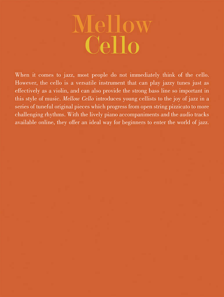 The tunes in Mellow Cello are designed to provide an introduction to jazz and popular music styles for young cellists, ranging from beginners to performers at a somewhat more advanced level. The first pieces use only open strings, both pizzicato and bowed: here, the cellist gains experience in counting rests as well as exploring the four strings. From pieces 4 to 9 the fingers are brought into play, starting with the first finger only, until all four are used. The pieces in the second half of the book allow the cellist to explore a variety of jazz styles. A piano accompaniment part is included for concert performances.
