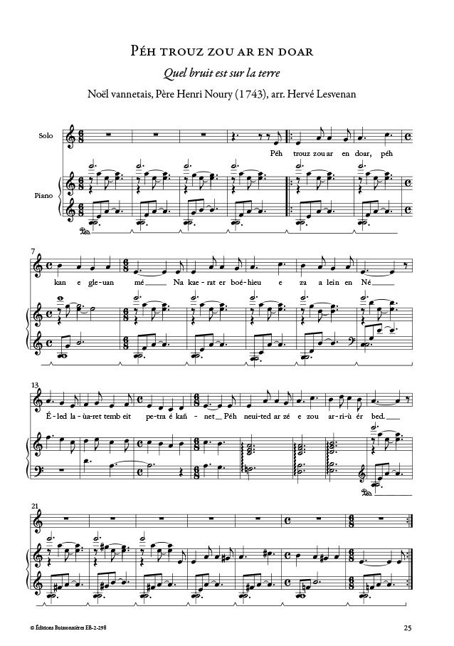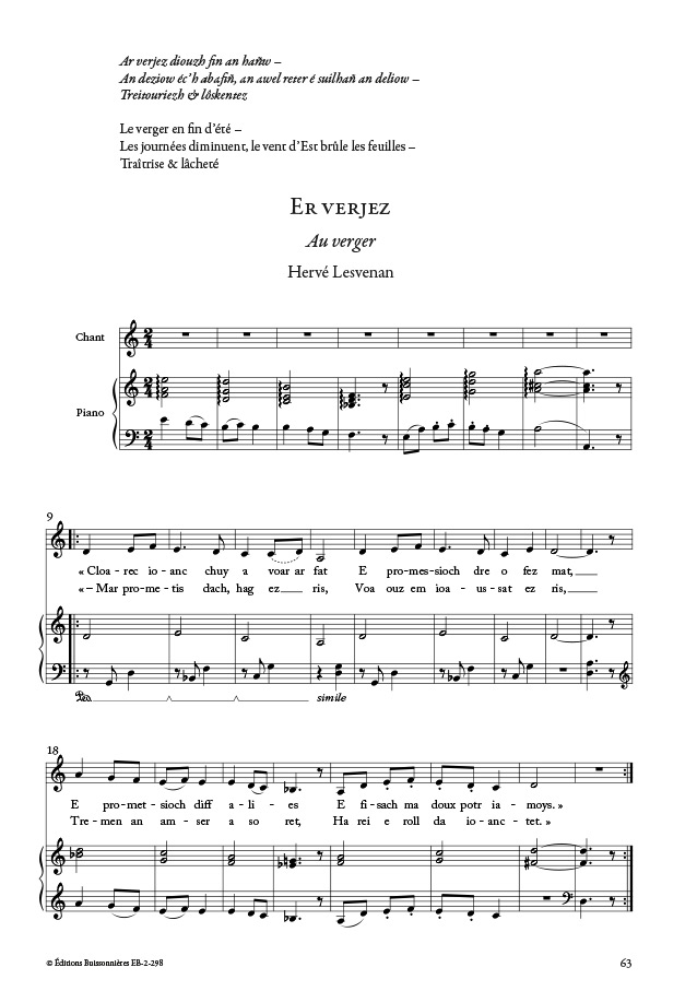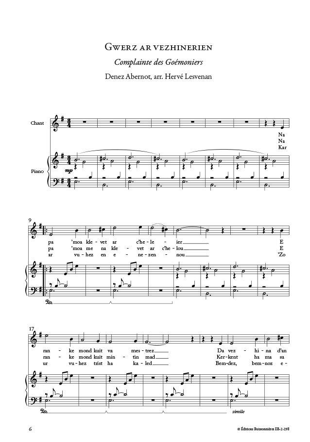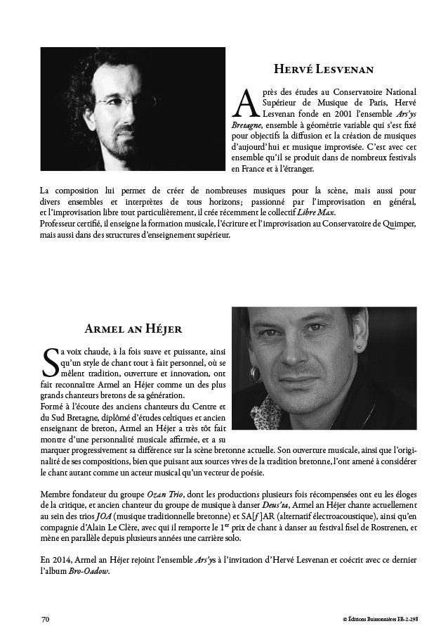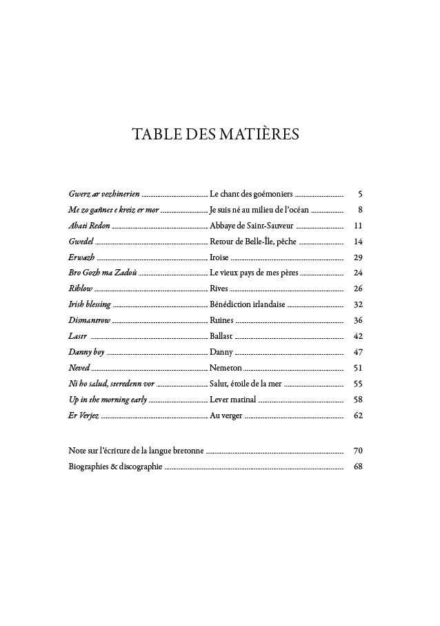 Par ces mélodies raffinées et pleines de poésie, Hervé Lesvenan se fait sculpteur autant que conteur ; il nous livre avec intimité son rapport à la Bretagne, mais aussi à l’ailleurs et au temps qui passe. Ce recueil réunit ses compositions et ses arrangements sur des mélodies traditionnelles de Bretagne, d’Irlande et d’Écosse.