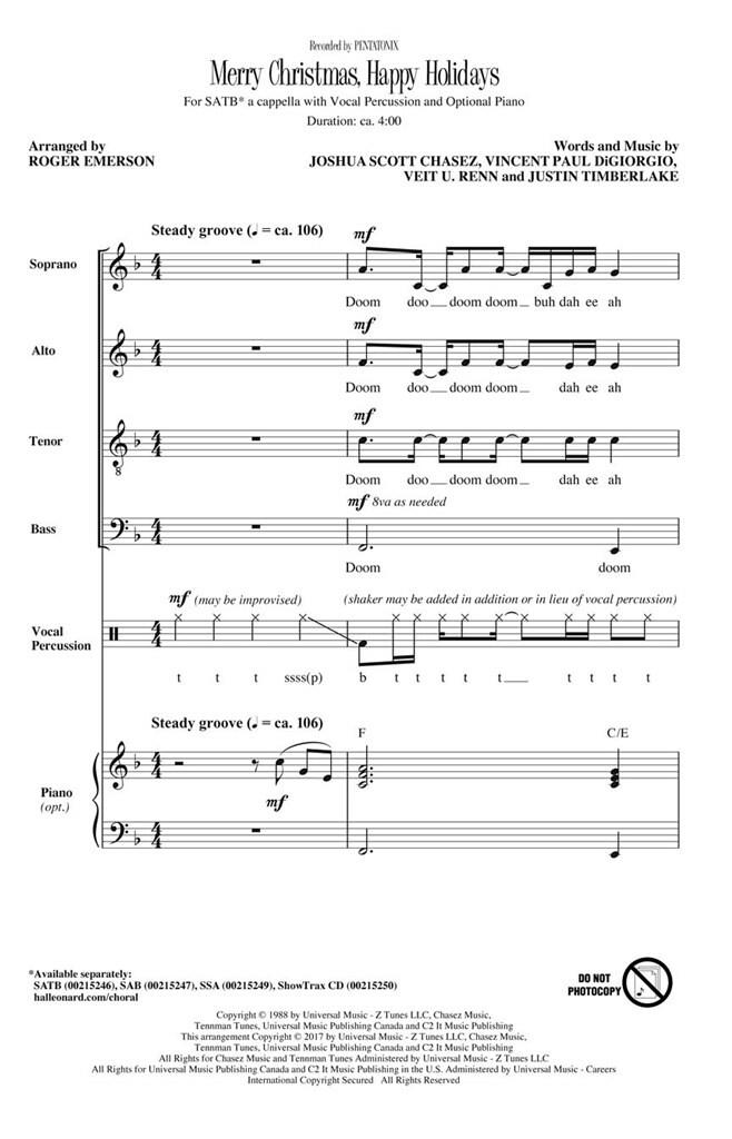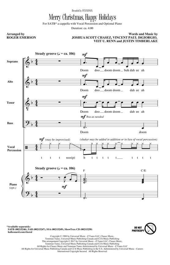Extrait de l’album de 2016 A Pentatonix Christmas, le groupe vocal populaire appose sa marque unique sur la chanson de Noël de 1998 de NSYNC. Les groupes mixtes et féminins apprécieront de recréer le groove rythmique de cette chanson entraînante a cappella ou avec la piste rythmique optionnelle également disponible.