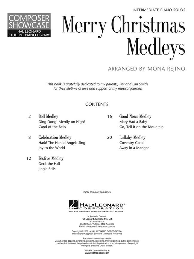 Célébrez les fêtes de Noël avec cinq medleys distinctif et de charme par magistrale arrangeur Mona Rejino. Ecrit pour piano solo intermédiaire, le medleys comprennent familiers chants de Noël combinés dans réconfortante combinaisons.