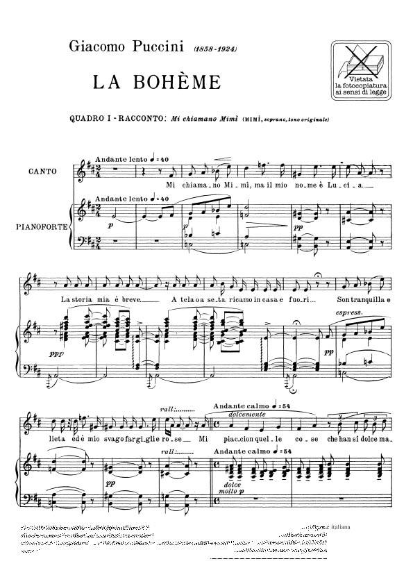 Mi Chiamano Mimi’ (Dall’Opera La Boheme) Per Canto E Pianoforte PUCCINI GIACOMO
