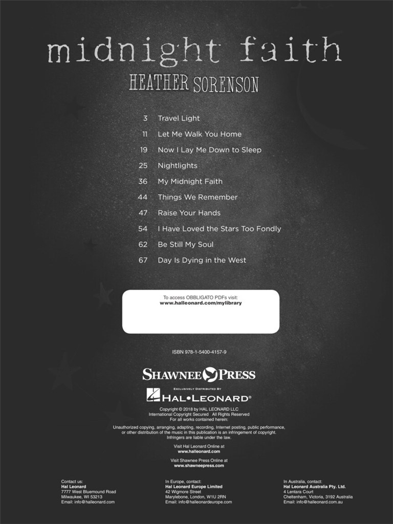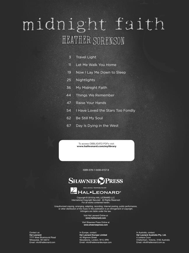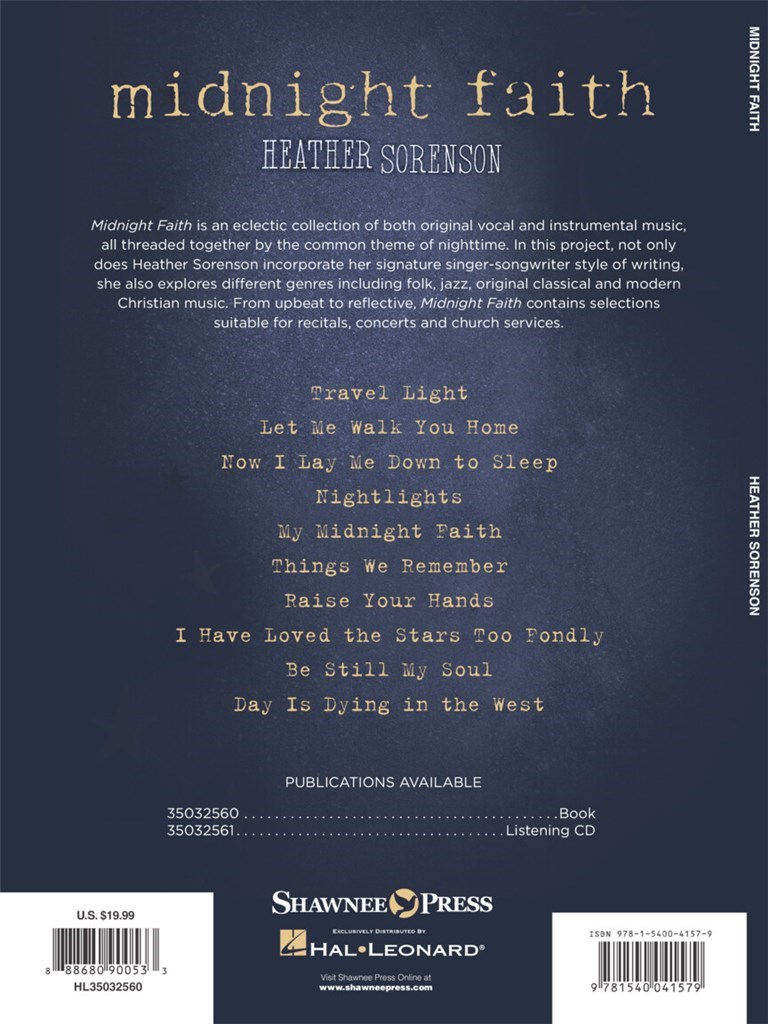 Midnight Faith is an eclectic collection of both original vocal and instrumental music, all threaded together by the common (and sometimes subtle) theme of nighttime. In this project, not only does Heather Sorenson incorporate her signature singer-songwriter style of writing, she also explores different genres including folk, jazz, original classical and modern Christian music. This music book is the companion product to the newly released album, and it includes a fully realized piano accompaniment and vocal score. From upbeat to reflective, Midnight Faith contains selections suitable for recitals, concerts and church services.