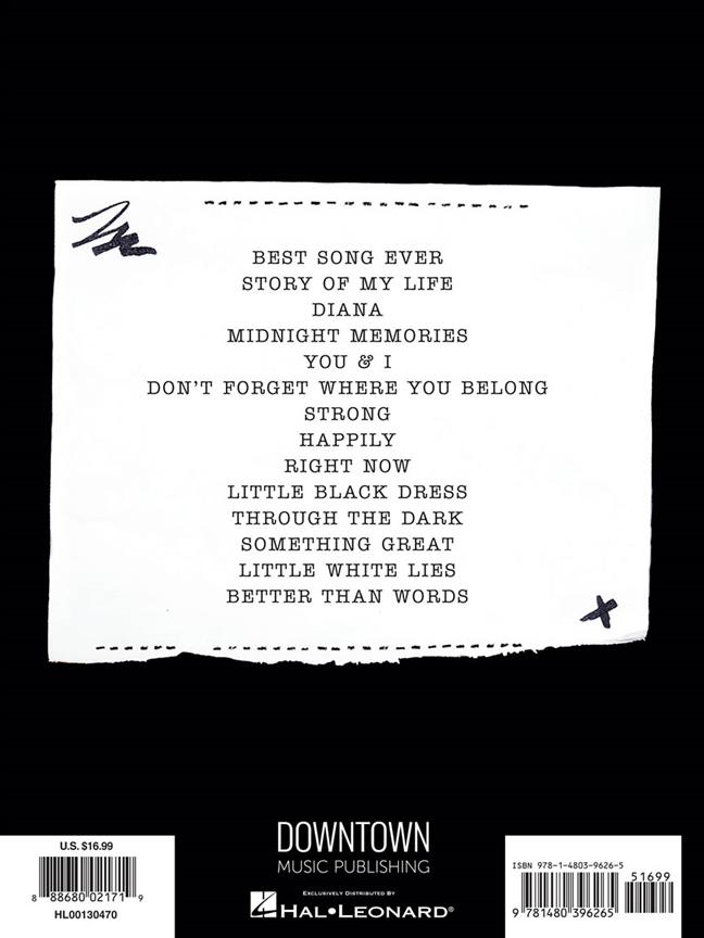 3e album du groupe en transcriptions piano voix et diagrammes d'accords guitare. Titres : Best Song Ever - Better Than Words - Diana - Don't Forget Where You Belong - Happily - Little Black Dress - Little White Lies - Midnight Memories - Right Now - Something Great - Story Of My Life - Strong