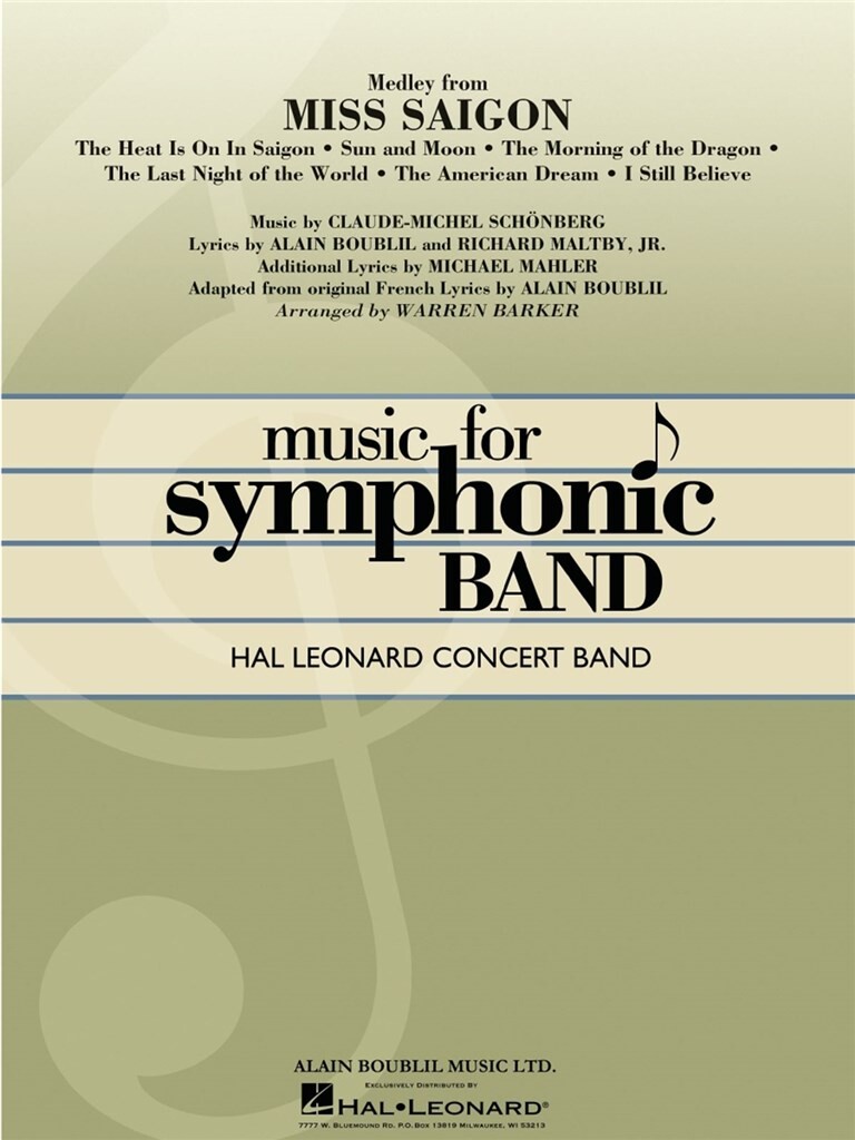 The Broadway blockbuster où the 90 ' s! from the writers où ' Les Miserables ' comes this new stage production, opening to the largest advance ticket sales in Broadway history. The music is truly stunning and Warren Barker ' simpressive showcase has captured the dramatic theatrical style. Includes: Sun And Moon; The Heat Is où In Saigon; The American Dream; I Still Believe; The Last Night où The World; and The Morning où The Dragon. Helicopter soundeffect cassette is included.