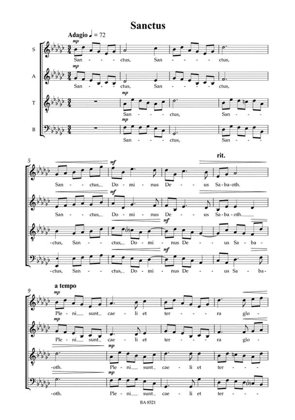The "Missa brevis in E flat minor” for mixed choir a cappella has been composed in the tradition of the short Mass (without Credo) and can be easily managed by most choirs. Thanks to its conciseness, it is suitable for use in church services, while its delightful harmonic layout and consciously simple melodies (with clear allusions to folk music) also make it perfect for concert performance.
