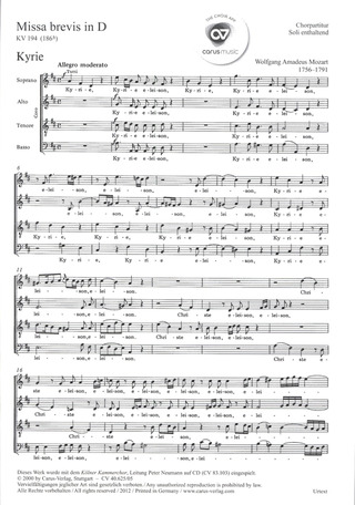 Gattungen: Missa brevis, lateinisch Reihen bei Carus: Stuttgarter Ausgaben (Urtext)