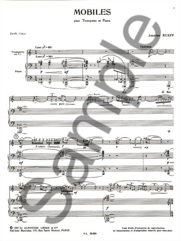 Composed for the Paris Conservatoire contest, Mobiles is a work for Trumpet and Piano by Jeanine Rueff. Rated as difficult, this piece is really interesting for the players as it helps them to focus on different areas of the technique that are necessary to pass the contest. Lasting seven minutes, this piece starts slowly on two measures to open on a cadenza. Followed by a more flexible part, it gets quicker with a Presto and a part Staccato. The sourdine is often used through the piece which also features many accidentals. Jeanine Rueff composed numerous pieces for Saxophones often used in contests, as well as many piecesfor Saxhorn, Clarinet, Horn and Cornet.