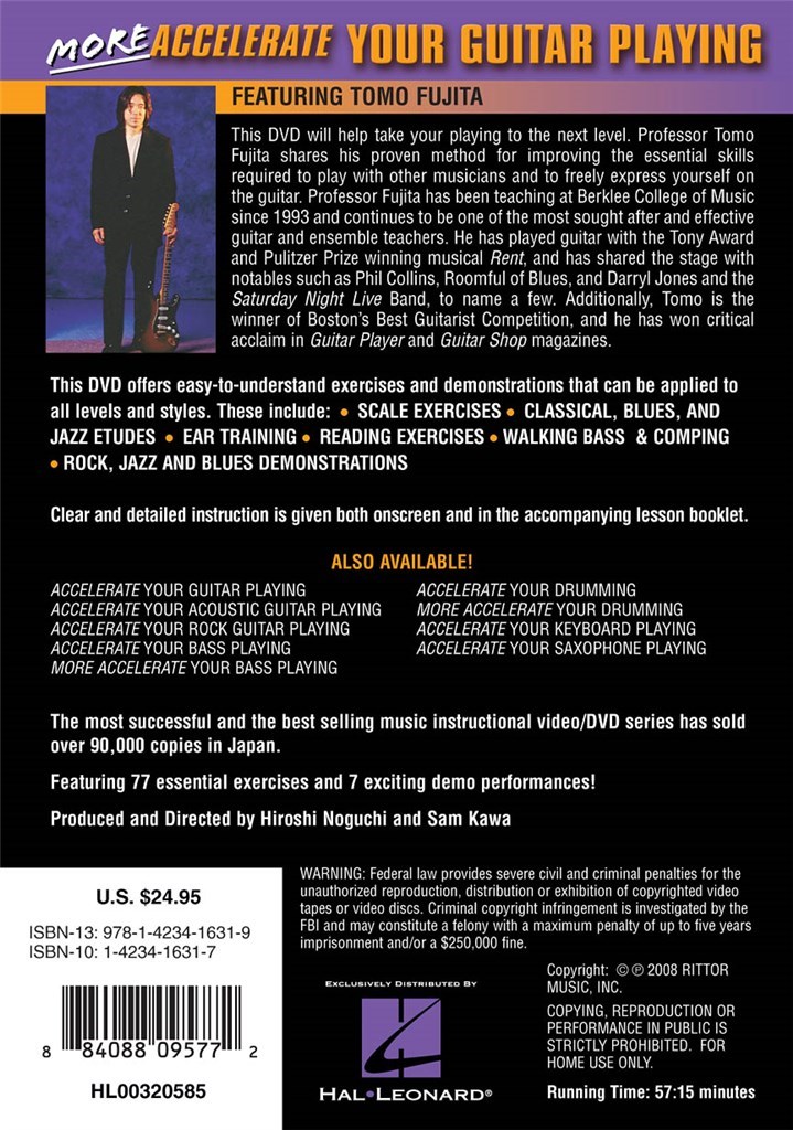 Ce DVD propose des exercices et des démonstrations faciles à comprendre qui peuvent être appliqués à tous les niveaux et styles. Celles-ci incluent : _scale exercices : études classiques, blues et jazz : entraînement auditif : exercices de lecture : contrebasse et accompagnement : démonstrations de rock, jazz et blues. Des instructions claires et détaillées sont données à la fois à l’écran et dans le livret de cours qui l’accompagne. Le professeur Tomo Fujita partage sa méthode éprouvée pour améliorer les compétences essentielles nécessaires pour jouer avec d’autres musiciens et s’exprimer librement à la guitare. Le professeur Fujita enseigne au Berklee College of Music depuis 1993 et continue d’être l’un des professeurs de guitare et d’ensemble les plus recherchés et efficaces. Il a joué de la guitare avec la comédie musicale Rent, lauréate d’un Tony Award et du prix Pulitzer, et a partagé la scène avec des personnalités telles que Phil Collins, Roomful of Blues, Darryl Jones et le Saturday Night LiveBand, pour n’en citer que quelques-uns. De plus, Tomo est lauréat du concours du meilleur guitariste de Boston, et il a reçu des éloges critiques dans les magazines Guitar Player et Guitar Shop.