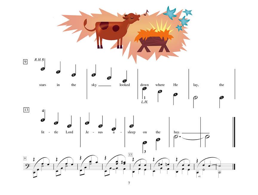 7 songs: Away in a Manger - Deck the Hall - The Huron Carol - I Saw Three Ships - Jolly Old St. Nicholas - O Come, Little Children - Up on the Housetop. Books 1 and 2 and the Pre-Staff edition feature lovely color illustrations.