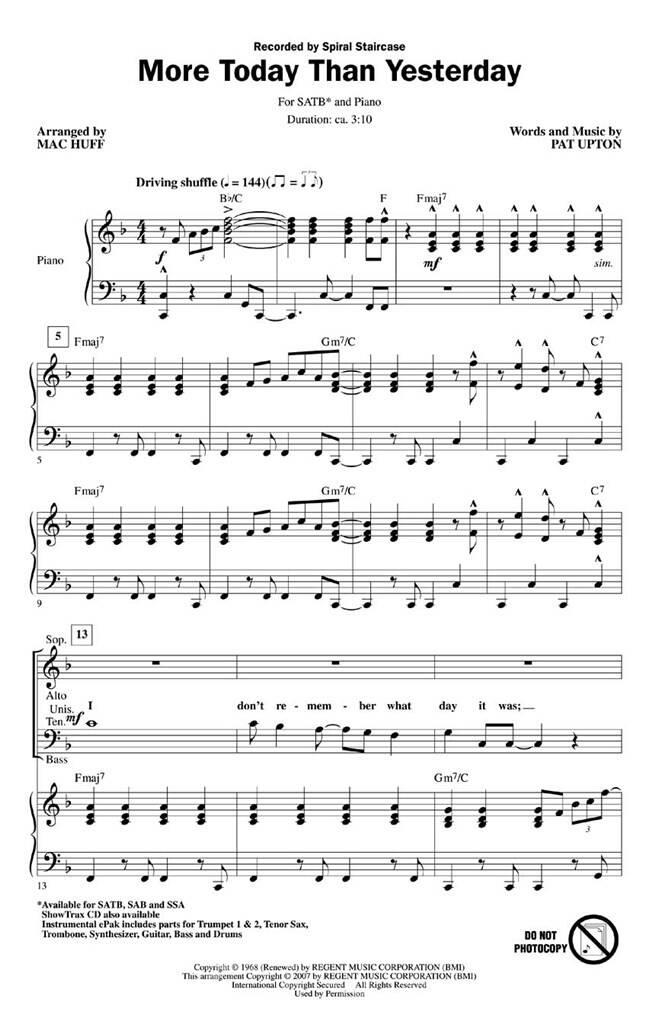 Oh, je t’aime plus aujourd’hui qu’hier, mais pas autant qu’à demain. Facile à apprendre en peu de temps, votre groupe brillera avec cette ballade pop nostalgique. Disponibles séparément : SATB, SAB, SSA, ePak instrumental et CD ShowTrax. Durée : environ 3:10