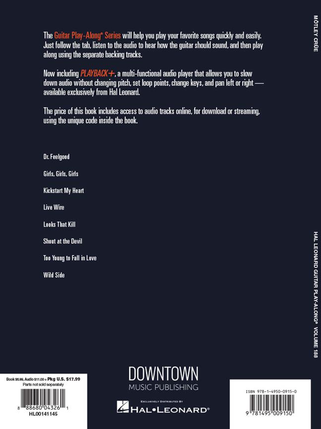 La série Guitar Play-Along vous aidera à jouer vos chansons préférées rapidement et facilement ! Il suffit de suivre l’onglet, d’écouter l’audio en ligne pour savoir comment la guitare doit sonner, puis de jouer en même temps avec les pistes d’accompagnement séparées. La mélodie et les paroles sont également incluses dans le livre si vous souhaitez chanter, ou simplement pour vous aider à suivre. 8 chansons : Dr. Feelgood · Filles, filles, filles · Redémarrer mon cœur · Live Wire · Looks That Kill · Crie au Diable· Trop jeune pour tomber amoureux · Côté sauvage. Le prix de ce livre inclut un code unique qui permet d’accéder aux pistes audio en ligne, en téléchargement ou en streaming. Les pistes incluent PLAYBACK+, un lecteur audio multifonction qui permet de ralentir le son sans changer de hauteur, de régler des points de boucle, de changer les touches et de faire un panoramique à gauche ou à droite – disponible exclusivement chez Hal Leonard.