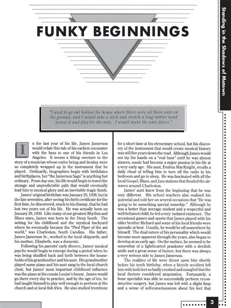 La vie et la musique du légendaire bassiste James Jamerson. Le bassiste James Jamerson était l'incarnation de l'esprit de la Motown et groove - l'entité invisible dont le jeu inspiré des milliers. Sa vie tumultueuse et brillance musical sont explorés par le biais des centaines d'entrevues en profondeur, 49 transcrit les partitions musicales, deux heures de spectacles All-Star Game enregistrées et plus de 50 photos rarement vus dans cet hommage stellaire de Motown dans les coulisses. Comporte un CD de 120 minutes ! Documentaire de 2002 de Allan Slutsky du même nom est le vainqueur de la New York Film Critics meilleur documentaire de l'année !
