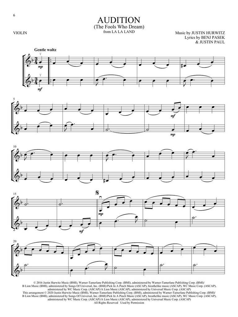Conçu pour les violonistes familiers avec la première position et à l’aise pour lire les rythmes de base, chaque arrangement de deux pages de cette collection comprend un violon 1 et un violon 2 voix, chacun jouant la mélodie à tour de rôle pour une expérience d’ensemble amusante et exigeante. Les chansons incluent : Audition (The Fools Who Dream) · Ville des Étoiles · Dancing Queen · Chute lente · Comment un moment dure-t-il éternellement ? J’ai rêvé un rêve · Lave · Le thème de Mia & Sebastian · MILLE DE RÊVES · L’endroit où vont les objets perdus · Peu profond · Star Wars (Thème principal) · Demain · et plus encore.