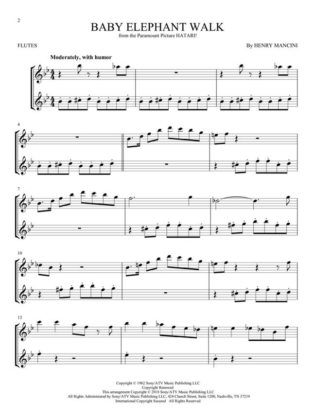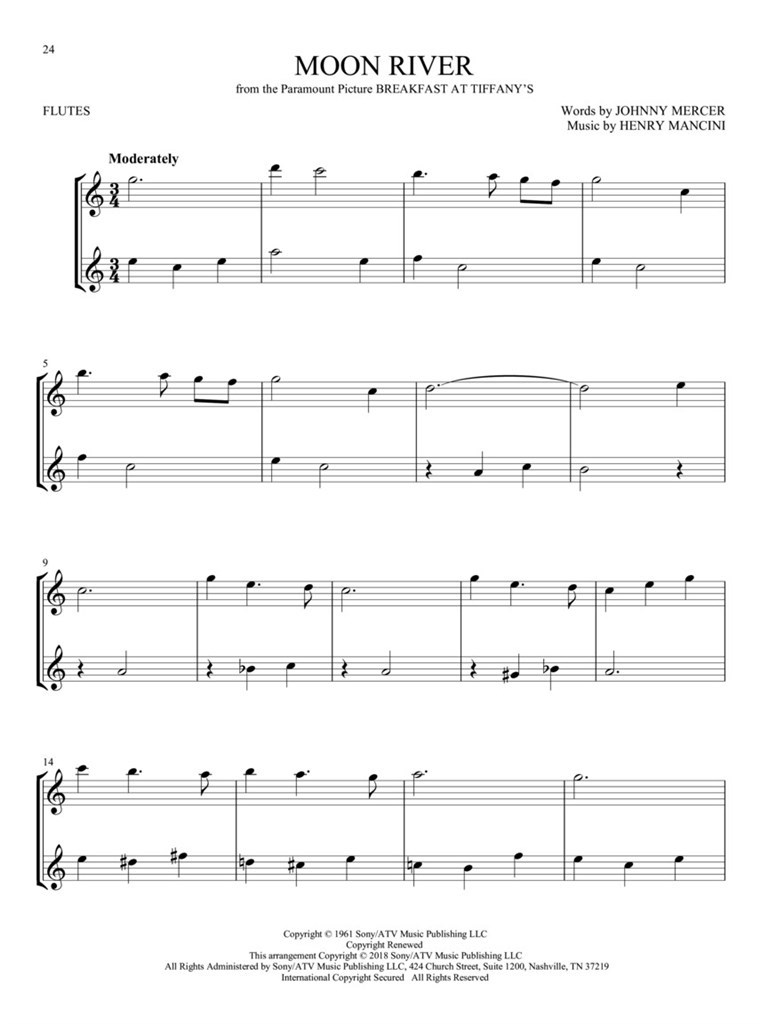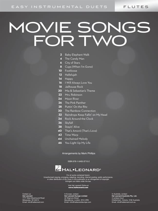 23 blockbuster hits in easy duet arrangements for two instrumentalists are featured in this collection: City of Stars • Footloose • Hallelujah • Moon River • The Pink Panther • Puttin' on the Ritz • Skyfall • That's Amore • and more. Arrangements work for two of the same instrument or can also be used with the other woodwind or brass titles from this series.