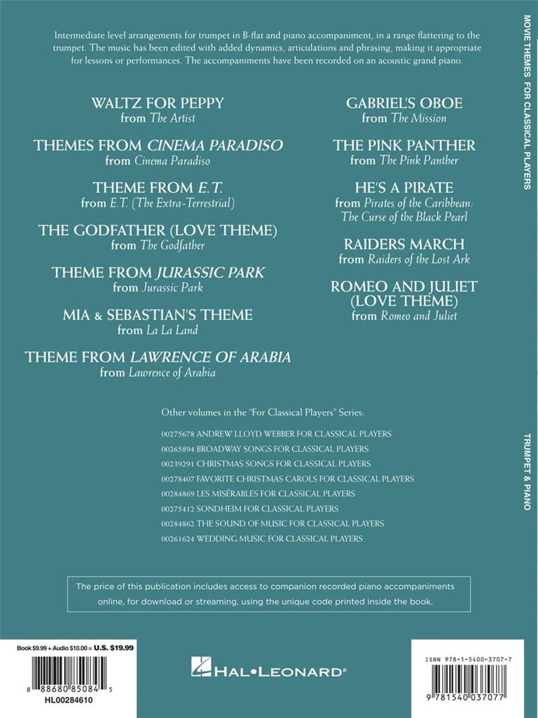 Ce recueil pour instrument solo et accompagnement de piano de niveau intermédiaire contient des arrangements de musiques de film. Sommaire : Theme from E.T. (The Extra-Terrestrial) · The Godfather (Main Theme) · He's a Pirate (Pirates of the Caribbean) · Theme from Jurassic Park · Mia and Sebastian's Theme (La La Land) · The Pink Panther · et bien d'autres.