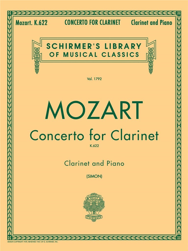 Partitions pour clarinette Bb et accompagnement piano du Concerto Pour Clarinette (K.622) de Wolfgang Amadeus Mozart. Reduction piano Eric Simon.