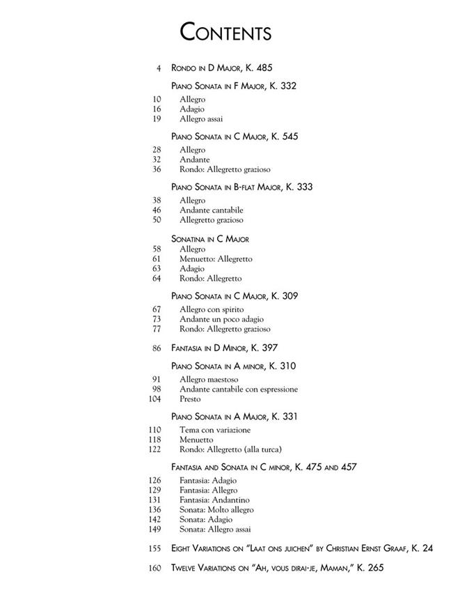 Mozart : Œuvres préférées pour piano comprend 12 pièces bien connues, dont les sonates les plus jouées, le Rondo en ré majeur K. 485, la Sonatina en do majeur, et les Douze Variations sur « Ah, vous dirai-je, Maman ».